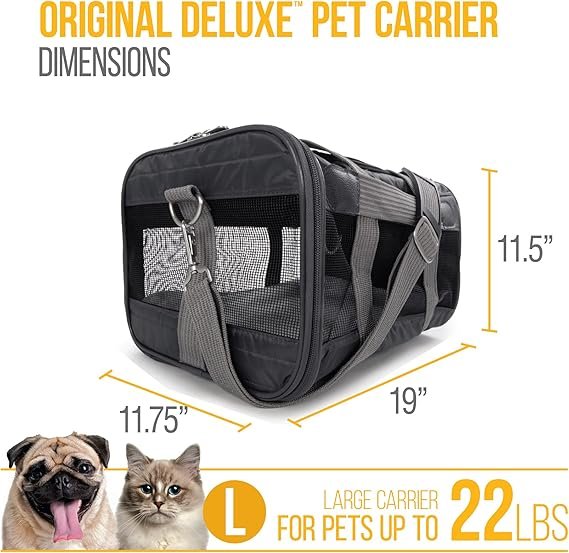 Sherpa Original Deluxe Airline-Approved Pet Carrier is a soft-sided, under-seat travel bag designed for cats and small dogs. It features breathable mesh on all sides for airflow, a flexible spring-wire frame for a secure fit under most airline seats, locking zippers, and a padded, machine-washable liner for comfort. A no-slip shoulder strap and rear luggage strap make airport travel easy, while the top and side entry simplify loading. Ideal for flights, car rides, and vet visits—check size to ensure the perfect fit.